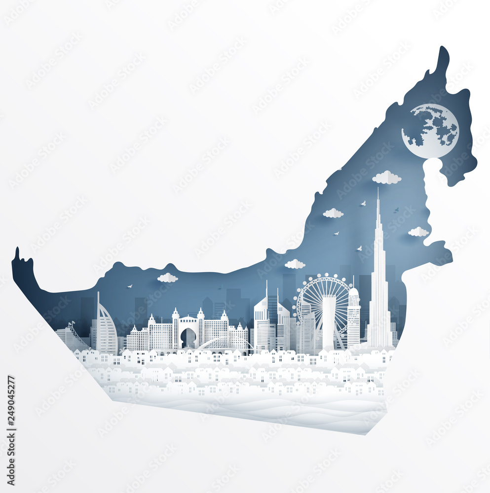 Dubai map concept with famous landmark for travel postcard and